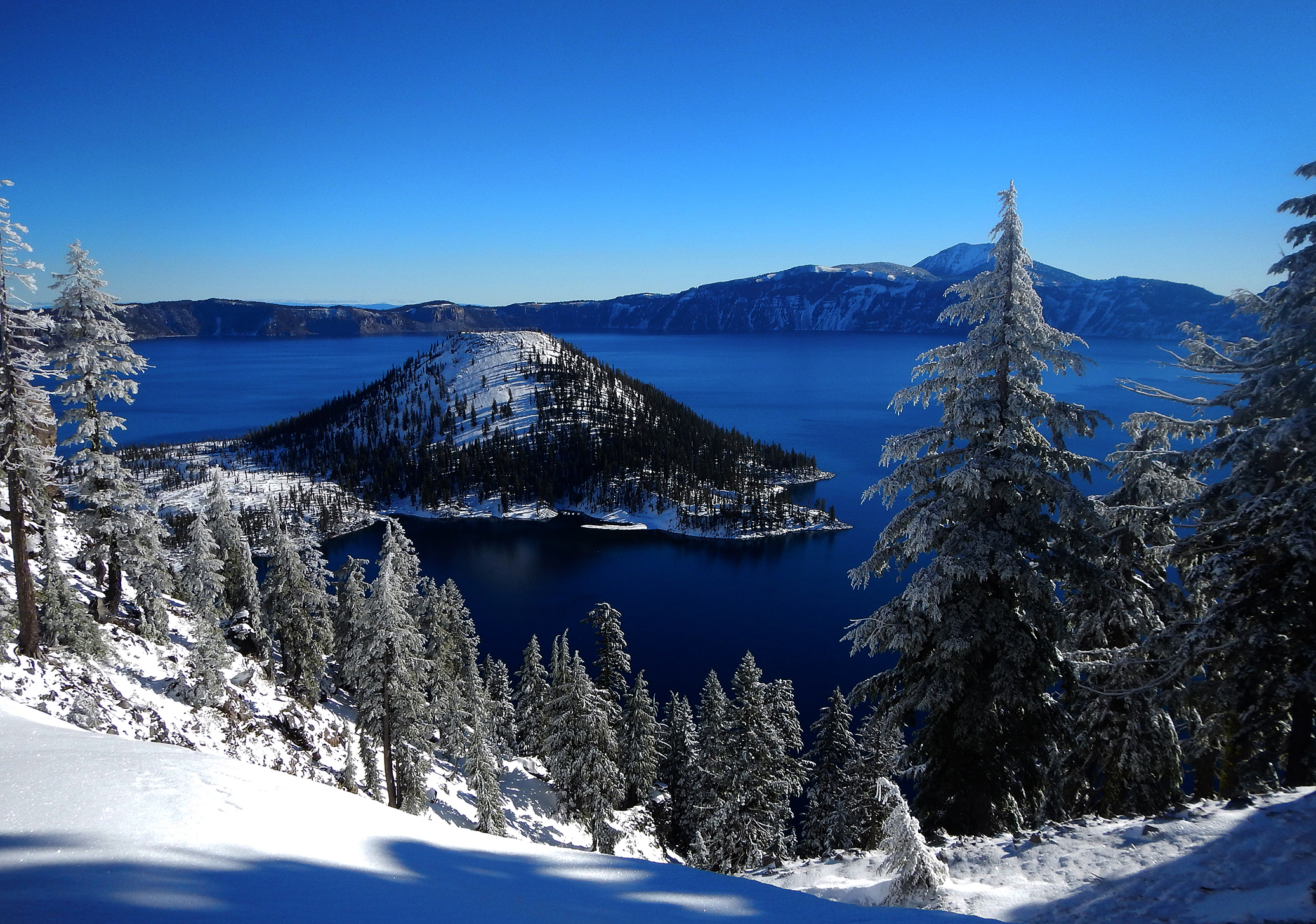 The route around Crater Lake follows a paved road which permits driving around the entire lake in Summer. In Winter, there is road access to the rim, but the Rim Drive remains unplowed, and so provides an excellent means for circumnavigation. At 33 miles and with a total elevation gain and loss of around 8000′, it’s long but mellow.